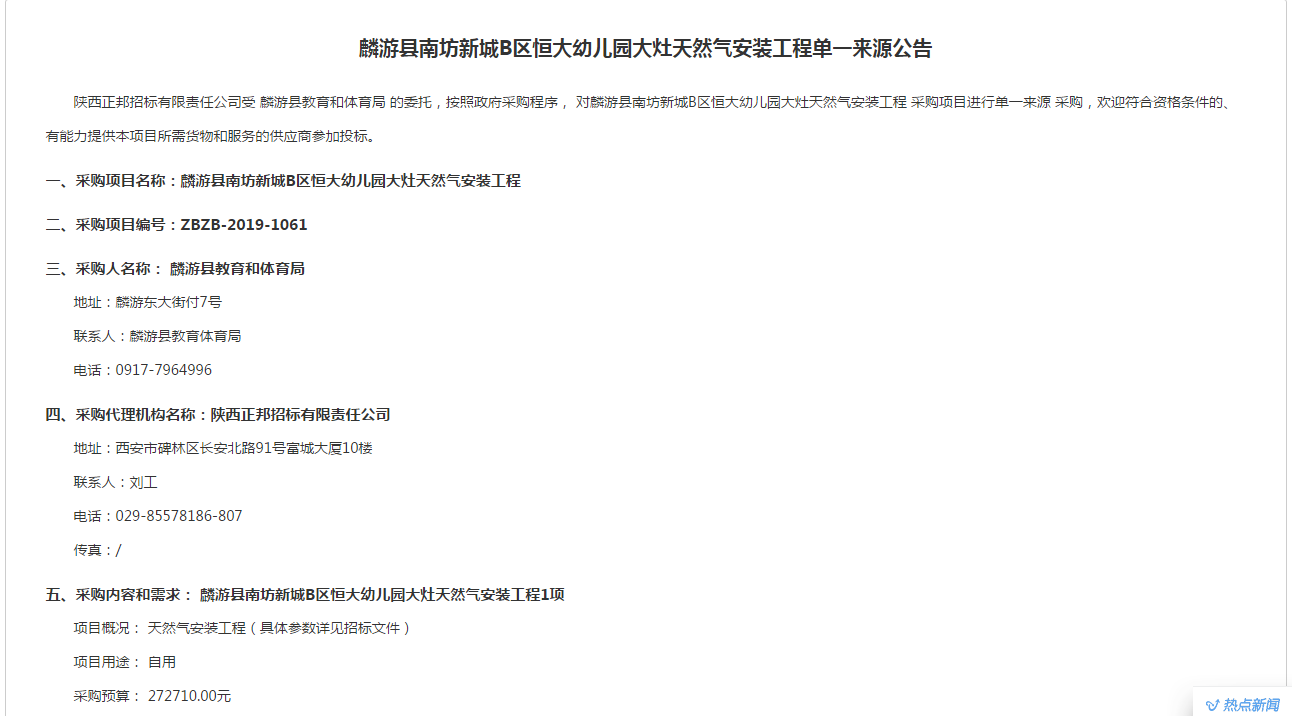 麟游縣南坊新城B區恒大幼兒園大灶天然氣安裝工程單一來源公告