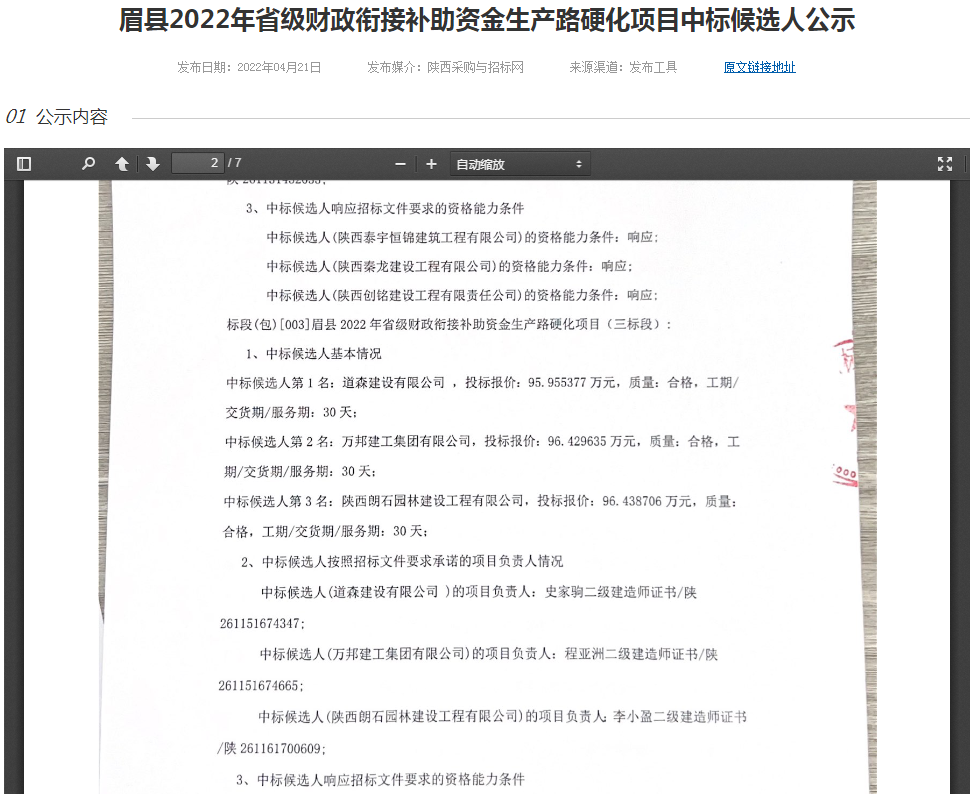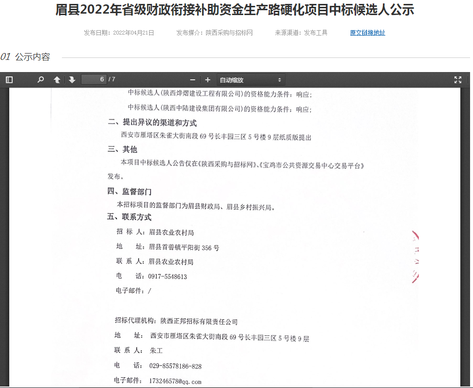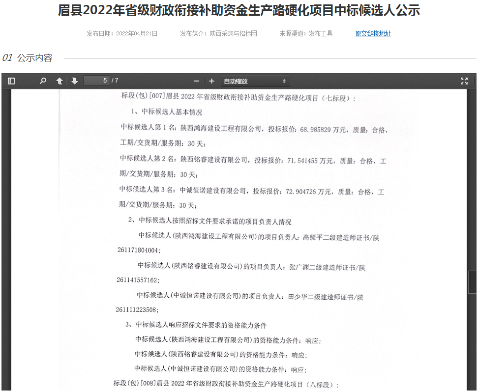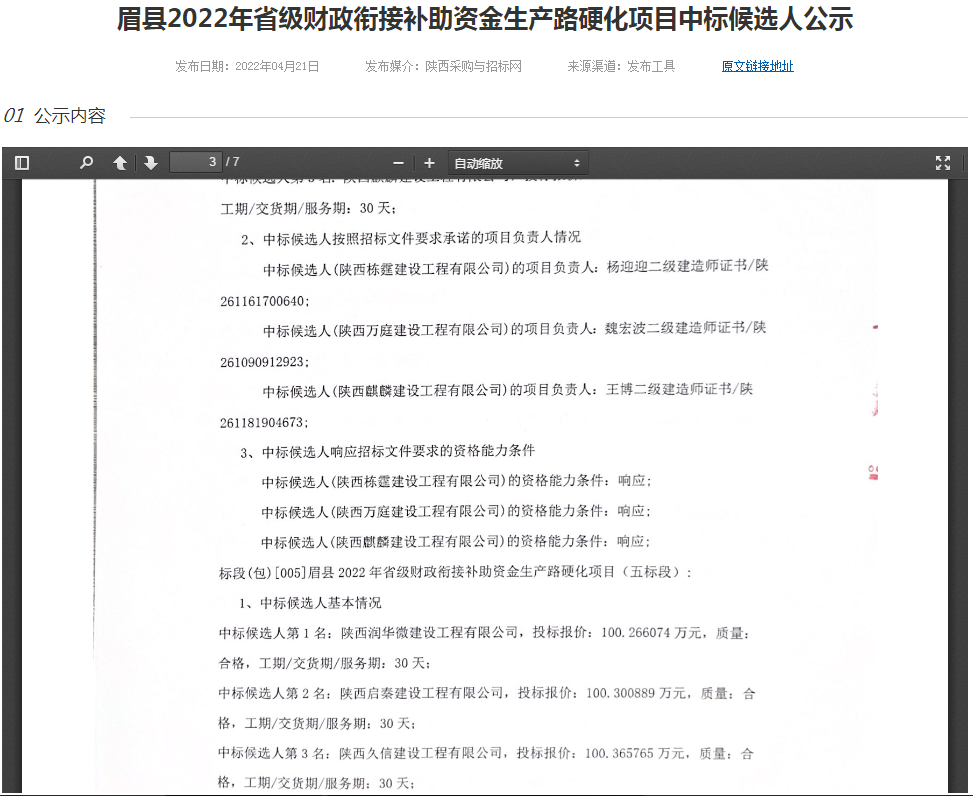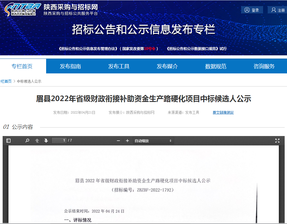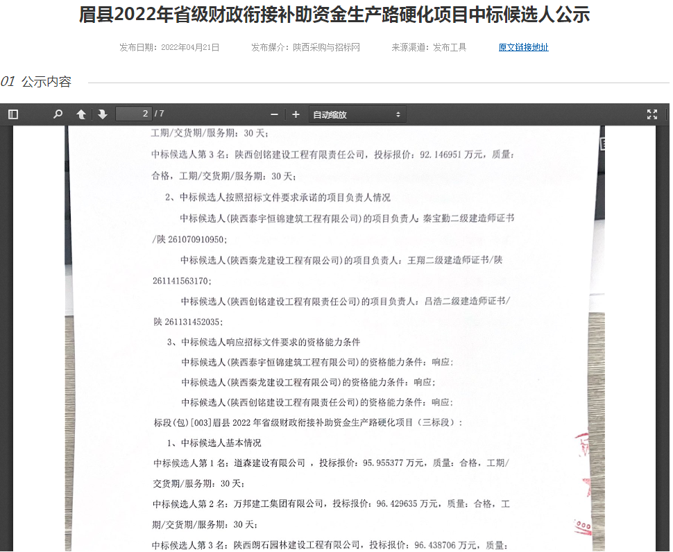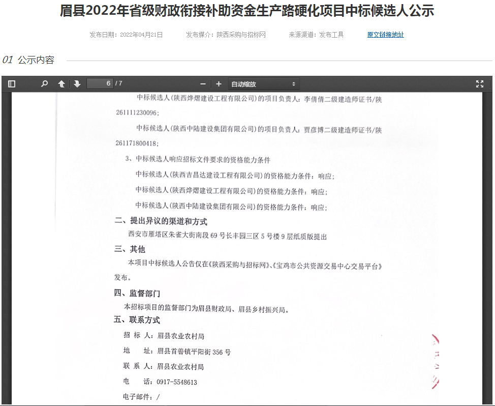 眉縣2022年省級(jí)財(cái)政銜接補(bǔ)助資金生產(chǎn)路硬化項(xiàng)目中標(biāo)候選人公示