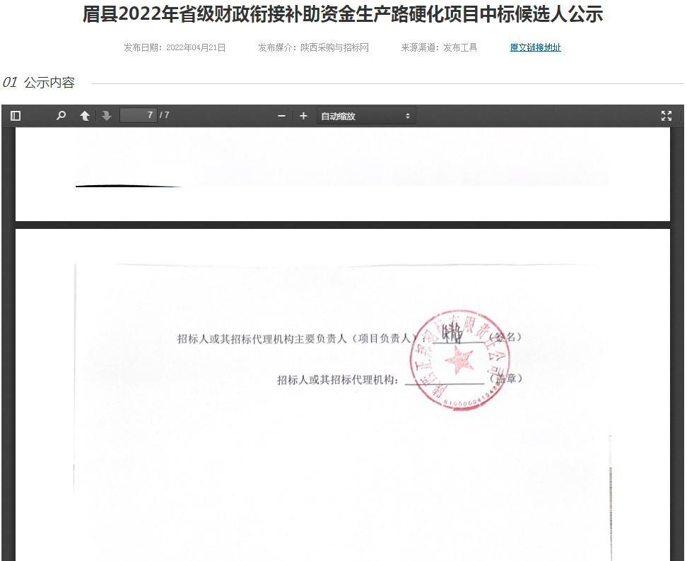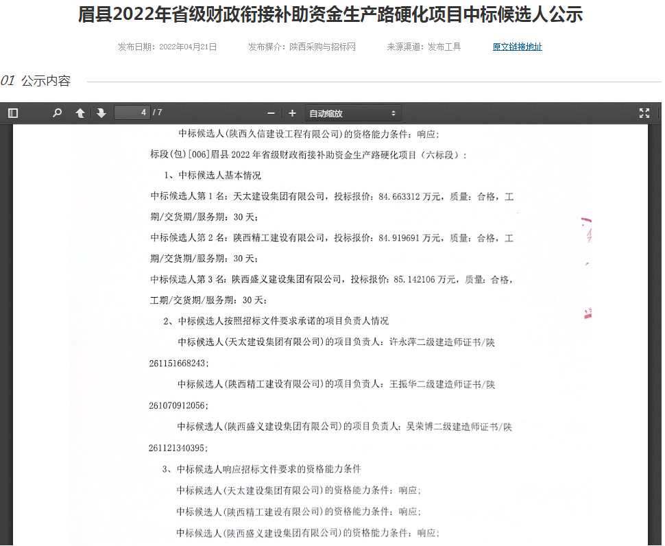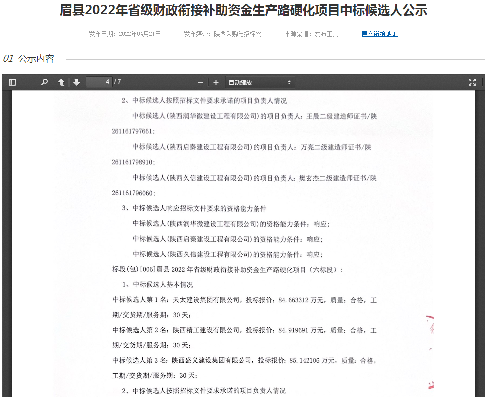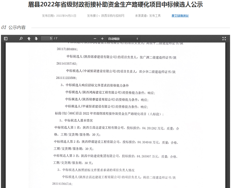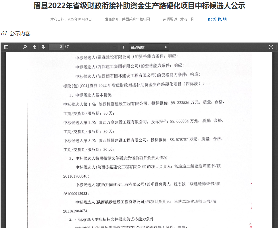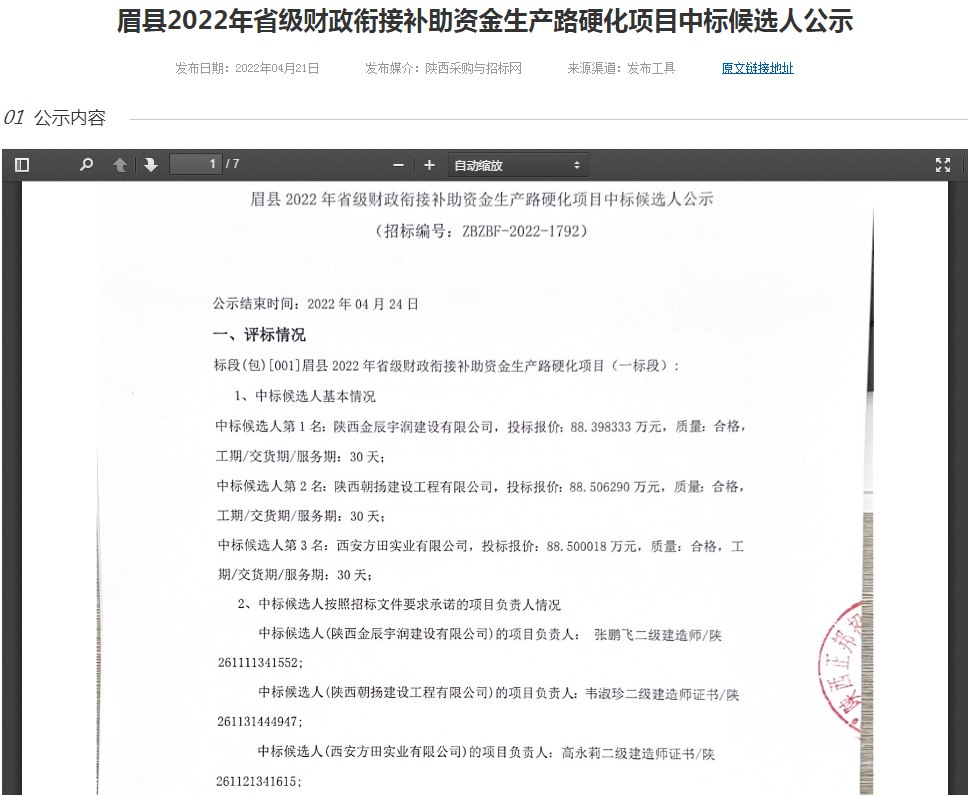 眉縣2022年省級(jí)財(cái)政銜接補(bǔ)助資金生產(chǎn)路硬化項(xiàng)目中標(biāo)候選人公示