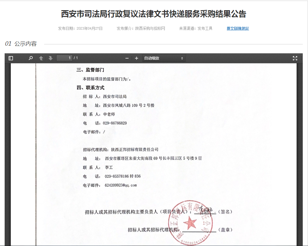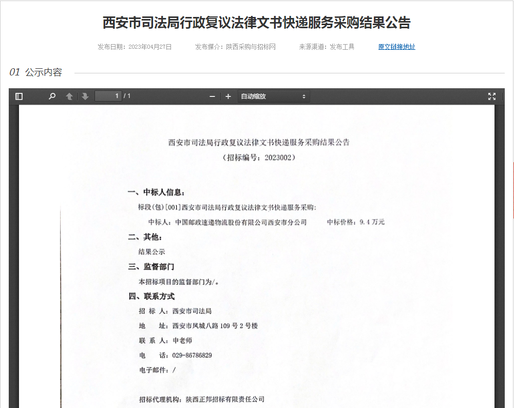 西安市司法局行政復(fù)議法律文書(shū)快遞服務(wù)采購(gòu)結(jié)果公告